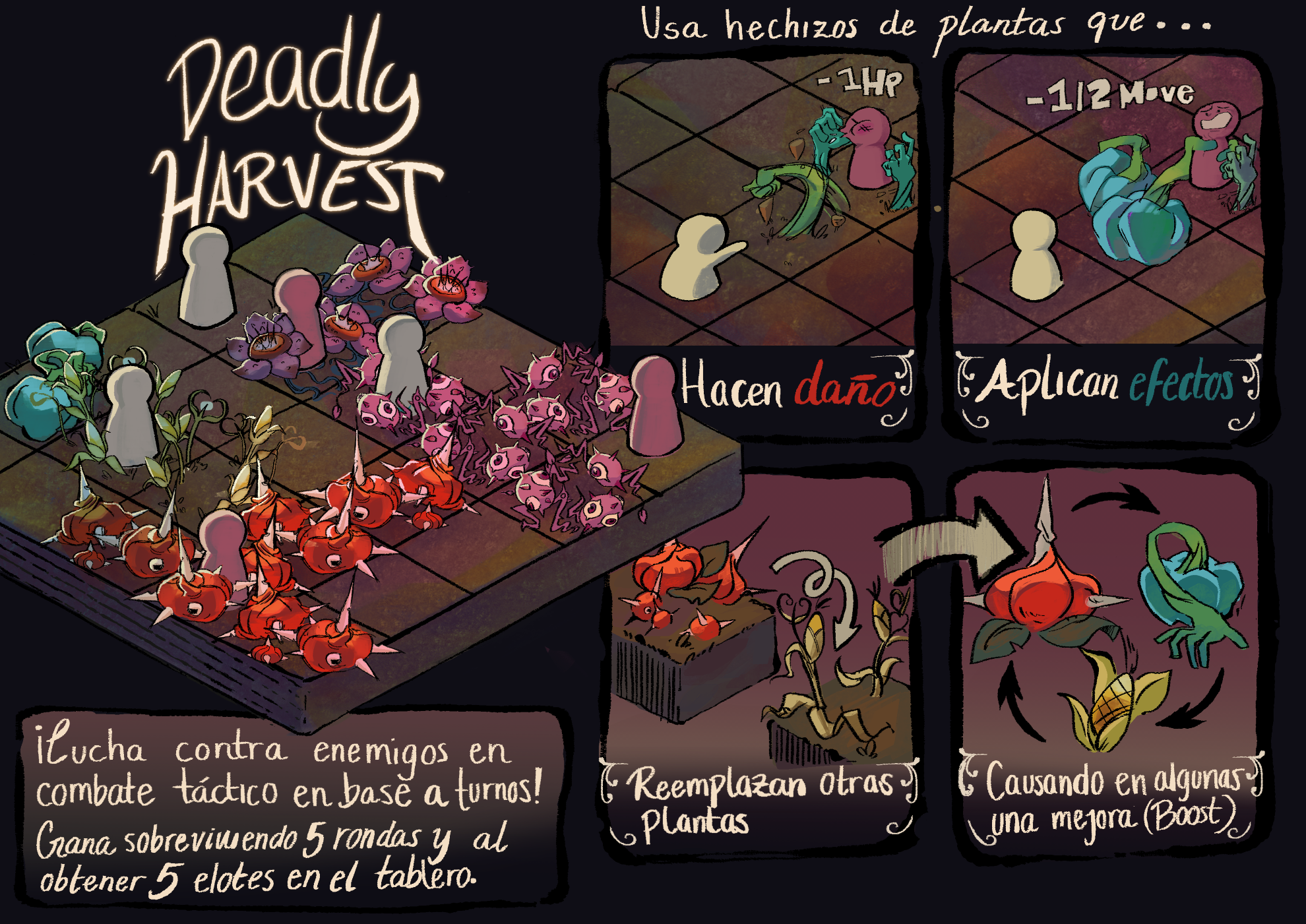 Deadly Harvest is a Micro-Tactics RPG with enfasis on the puzzle side of figuring out difficult combats. You play as a coven of witches defending your garden from Weeds, evil monster plants looking to destroy your garden. You use Area of Effect spells that leave magic plants in their wake to fight off these intruders, each of these magic plants has a unique effect.