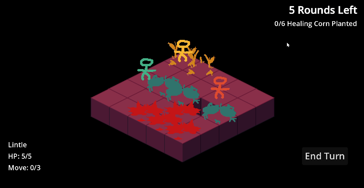 With this prototype we started being able to tackle the problems with our design quickly. The goal of each level is to survive a certain amount of rounds (generally 5) and ending with a certain amount of a type of plant on the board (for example, 6 healing corns). Originally the enemies used the same plants as the player, but thanks to this early testing we we're able to figure out that that opened up the possibility of the enemy healer placing healing corn and winning the level for you even if you were playing horribly, so we had to make the enemies use a different variation of the player plants that doesn't count to your totals.